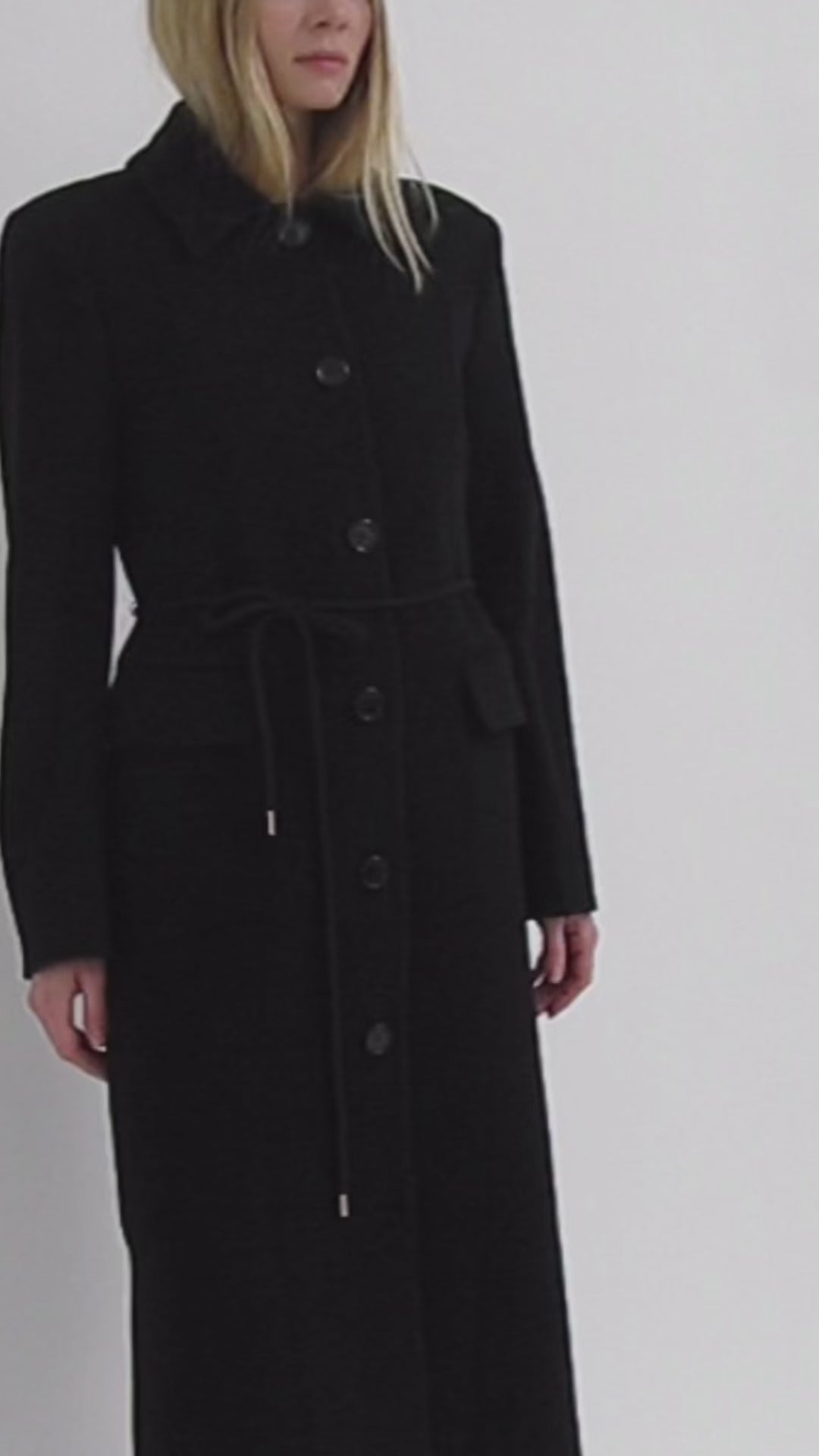 An elegant I-RUI coat crafted in soft Italian wool with a high neckline and sculpted silhouette. Designed to contour the body with subtle structure, it draws in at the waist and flares gently at the hem. Panelled construction shapes the coat with quiet precision, making it a refined layer for both everyday wear and dressed occasions.